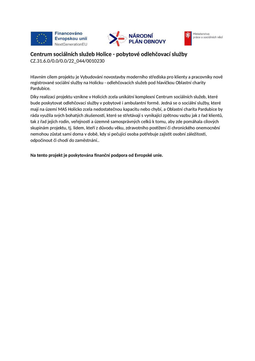Oblastní charita Pardubice realizuje v období 1/2024 až 12/2025 v Holicích, Dudychova 782 vzdělávací projekt RORO 50+ CZ.03.01.02/00/22_037/0002621.